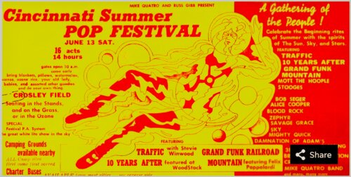 The very first Atlanta Pop Festival was held a month before the Woodstock Festival in 1969, and ended with the most rave reviews imaginable. It was held over the fourth of July weekend in 1969 in Hampton, Georgia. Featured artists were: Janis Joplin, Johnny Winter, Blood Sweat and Tears, Spirit, Johnny Rivers (Friday power outage during his performance), Ten Wheel Drive, Canned Heat and Joe Cocker ended the first day. Saturday: Creedence Clearwater Revival, Sweetwater, Al Kooper with “Big Band” sound, Paul Butterfield Blues Band, Pacific Gas and Electric, Dave Brubeck, Delaney and Bonnie Bramlett, Led Zeppelin… a very early appearance of Grand Funk Railroad, who appeared even though they had yet to sign a record contract. Also, Chicago Transit Authority, before changing their name to just “Chicago”. The temperatures were nearing one hundred degrees. There were a few minor problems (if any) mostly heat related. It all ended on a very high note, Woodstock followed its template a month later, and tried to accommodate the audiences needs. As we all know, “Woodstock was unavoidably overwhelmed” and became a national disaster area in the process. Both festivals were blue ribbon winners!