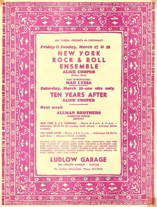 Detroit was put on by the same guy, and it was similar but was a bit cooler. I got into that and enjoyed it for what it was. There was a revolving stage, and the audience sat all around. There were four P.A. cabinets around this revolving thing, and like we go on and start and like you’re singing, man, it’s weird, like you look and see somebody and you play and you look and it’s somebody else and like the room has got longer and the vocals and the P.A keep getting louder and then disappearing. In a way I enjoyed it, it was a mind-blowing experience.