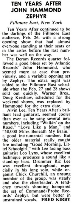 The history of the group’s American reception is unique in itself. Ten Years After has been through four American tours in less than two years, with not one supported by a hit single record. Four albums: Ten Years After – Undead – Stonedhenge – and Ssssh all on Deram Records, have met with exciting chart reception. A fifth album and a fifth tour are due for the first half of 1970.