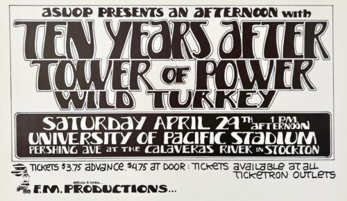 All was not peaceful at this concert. Garry Lemmons, a nineteen year old Madesto, California cannery worker, was killed and another man wounded from a “wild gun shot” during an altercation at the Pacific Memorial Stadium Concert that featured England’s Ten Years After, the Bay Area’s own Tower of Power and Ex-Jethro Tull members who formed Wild Turkey.