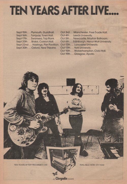 Ten Years After are to make their first British tour in almost a year. The news of the 14 – day tour was announced by Chrysalis this week and effectively puts paid to recent rumours that the group were about to split up. The tour, which opens at Plymouth Guildhall on September 15th, is the first from the group this year, and is their first British appearance since they headlined at the Alexandra Palace Music Festival a month ago. Rumours concerning the break up of the group began circulating at the time of release of “Recorded Live”, the group’s current album. Ten Years After stopped touring at that time as both Alvin Lee and organist Chick Churchill had begun work on solo projects. It was rumoured that Alvin Lee was to leave the group and form a new band with various musicians, namely ex- King Crimson members Mel Collins and Boz Burrell who he had been playing with at the recently-completed studio at Alvin’s home – Space-Studios.