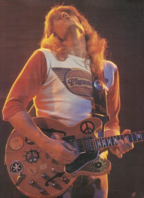 If his material surroundings are anything to go by, his mansion, his studio, the tasteful antique objects dotted round the place, his decade with Ten Years After has certainly set him up comfortably. “I wouldn’t like to have to move to the States,” he grimaced, looking round the spacious kitchen with its heavy oak timbers. “I know lots of people are moving out of England for tax reasons but I wouldn’t like money to rule my life too much.” Musicians seem to be divided into two schools, the first being the people who play for playing’s sake, and wouldn’t take any other job even if they were starving in the gutter, and the others who, while they enjoy playing, also see it as a means to an end, a worthwhile way to earn a lot of money.