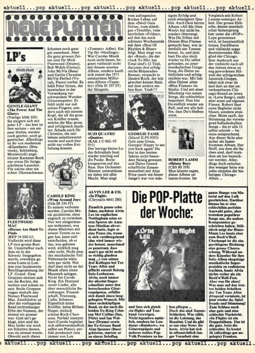 The man from German Phonogram doesn’t carry the best of omens around with him. “Ten Years After?” he says, and sticks a couple of thumbs up as he nods. “Alvin Lee?” The nose wrinkles and the eyebrows raise. If he’d known the word, he’d have said the prospects were dodgy. So, Alvin Lee, kicking the dust of Ten Years After from his shoes and getting out with his own band is something of a bold move. It’s also about time. The man who has described his old band as a good place for a work out on guitar, is now out of the musical gymnasium, and on the road with a band playing music that is much more to his taste, and to mine incidentally. As a prelude to their British date at Kilburn State, London on December 14th, and an American tour in the new year, Alvin Lee and Company have been on tour in Europe: while it isn’t exactly starting at the bottom again, they have been doing concert halls rather than huge stadiums, and people aren’t really sure what to expect. The “In Flight” album is only just out, hence the Phonogrammer’s insecurity about the box office, rather than musical performance.