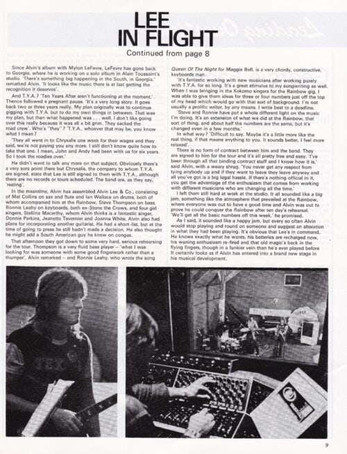 You can take it from Alvin that TYA are not so much in mothballs as in a mortuary. With the results of his solo Concert at London’s Rainbow last March now available as a rather tasty album, “In Flight”, Alvin Lee and Co. (that’s the name of his new band, of course) are touring Europe prior to a concert at the Kilburn State on December 14th, followed by a tour of the U.S. in January, and then Japan and Australia.
