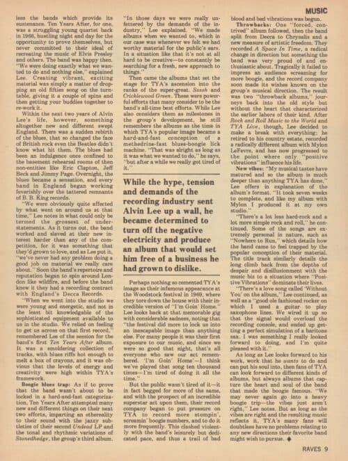 ALVIN LEE is a deceptive character. He’s never really worked at making his presence felt in the way Rod Stewart or Elton John have done, nor has he really quested for any Spokesman of the Guitar award. Critics find him generally dismissable – especially in America – and yet TYA could fill any of that country’s 20,000 seat Hippodromes with ease.