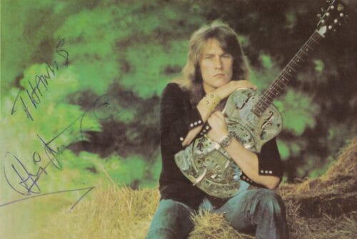 And tips for the budding guitarist? “Practice is essential. Time, patience and practise. Perserverance. Following one’s head rather than fashion. You have to really learn the instrument for two or three years before you can expect to play in a style. Just copy other people until you have a lot of different styles at your fingertips, and then your own style starts to come through, using the techniques you picked up from other people. I used to copy The Shadows, and Buddy Holly solos I could get off note for note. When the other kids used to go out looning around. I would stay in and practice the guitar. It took some doing and there was a lot of temptation to leave it, but I pressed on. It gives me satisfaction to do that, and when I’ve got a new chord worked in or whatever, it gives me a sense of achievement. My own style came out of Chuck Berry, really….and rhythm `n’ blues. Some of those simple players were the best. It’s not a question of what’s good and bad. Just because I don’t like most classical music isn’t to say it’s bad…