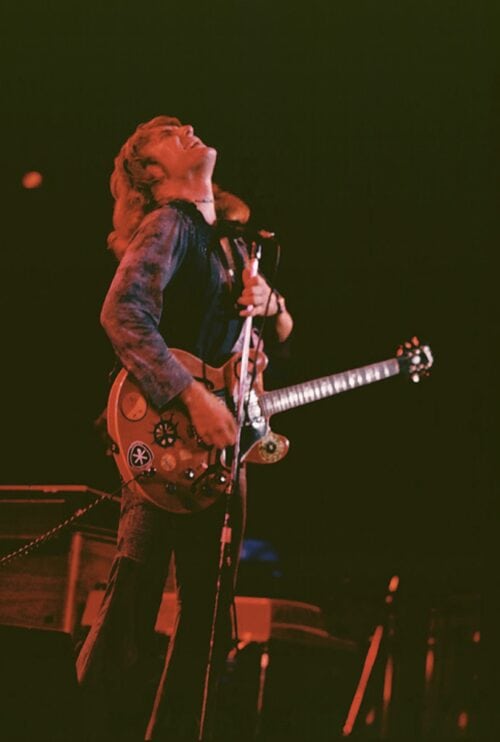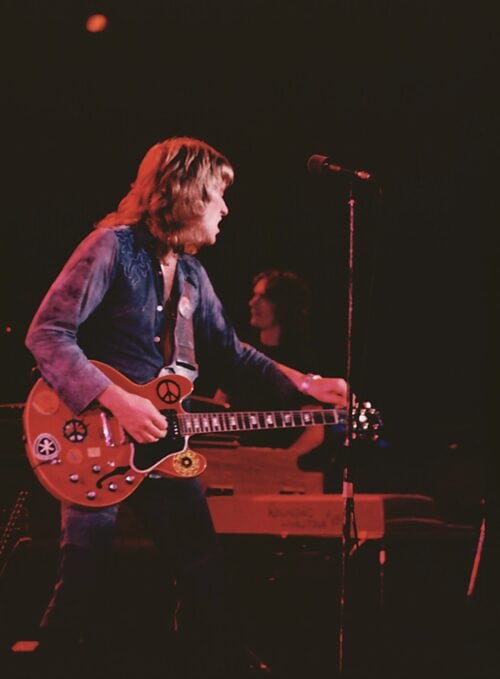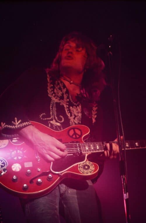“We’d play the old Fillmore and be able to just play. We had a respectful audiences then who would appreciate a jam or a swing. But after Woodstock,” he winces, “the audience got very noisy and only wanted to hear things like ‘I’m Going Home’. I’ve always been much more of a guitar picker but I began to feel forced into a position of being the epitome of a rock & roll guitarist. Originally TYA wanted to make it without having to compromise to pop. It worked for a while but after five or six years the fun went out of it for me, a lot of the music went out of it. And,” he smiles shyly, “all I wanted to be was a musician. With this new band I feel relaxed. I have enough freedom that I don’t feel pigeonholed anymore. Everyone thinks of the group as my solo thing but I think of it as a band. Everyone in the group is free, everyone is their own musician. It’s up to each individual what they play. This band is just good fun. The excitement of not knowing what will happen next is great; it’s a welcome change. It really is like going back to the roots; feeling enjoyment in the music again is how TYA used to feel.”
