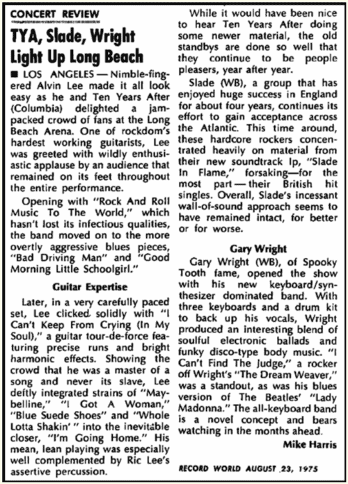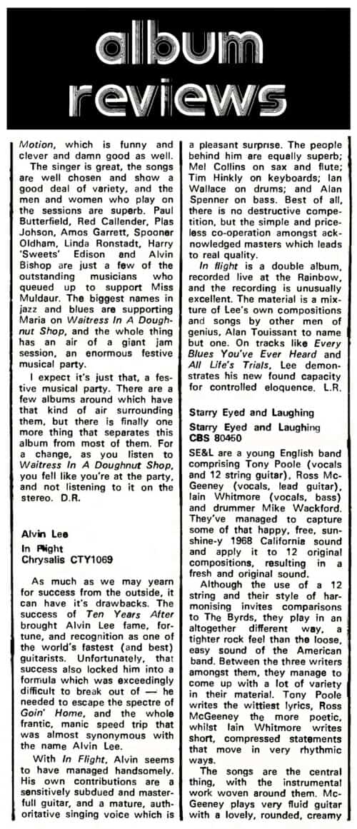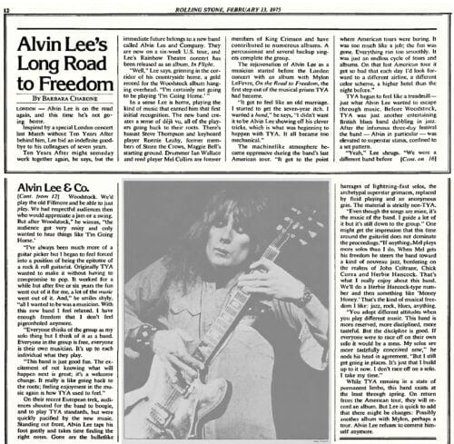 The momentum from that concert resulted in Lee agreeing to take the company out on the road, and its been one hell-of-an experience for Alvin who was a prisoner of his own imagination. With slightly altered personnel from that on the LP, Lee hit the road in January on a tour that’s been extended several weeks because of the high level of enthusiasm that the band has met with, and this new unit is no rehashed Ten Years After.