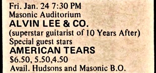 On the bill are: Alvin Lee & Co – Gentle Giant – American Tears
