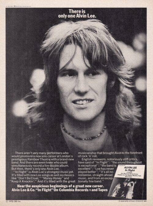 It took a dare from George Harrison’s aide-de-camp, Terry Doran, to get Lee back into the music world after that last Ten Years After tour. Lee had again retired and was one day sitting around the Harrison homestead, when Doran challenged Lee to get off his ass and do something. “I can do whatever I want, when I want,” said Lee. “No you can’t,” teased Doran, and Lee retorted, “Yes I Can” back and forth until Lee had committed himself to doing something. The result was much like the initial indications on a seismograph that something big was coming. Four weeks later, Alvin had drawn together some of the best available musicians under the banner, Alvin Lee and Company. A date at London’s Rainbow Theatre was booked and once again Alvin was out of retirement. The concert was recorded and released as Lee’s latest Columbia effort, “In Flight”.