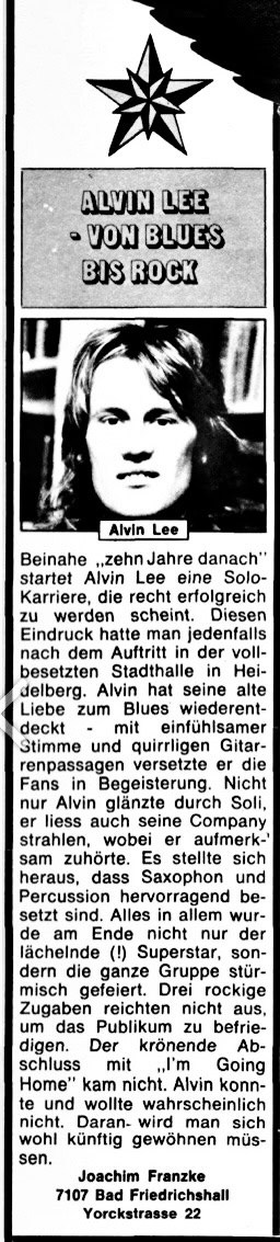 Alvin Lee is continuing to work as a soloist, while Ten Years After remain active, and this week finds him on the road undertaking his first ever British tour with his own band. With a line up comprising former members of Stone The Crows and King Crimson. Alvin Lee & Company have dates during this gig period at Dagenham (Saturday) and Hemel Hempstead (Sunday)