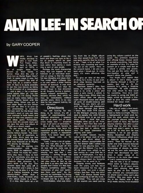 WITH ALVIN spieling so candidly it’d be remiss not to bring up the subject of TYA – remember. Of course what it’s not in vogue these days to announce the fact when a major band splits up. So, like the Moody Blues, TYA is “inactive” – only because nobody will say, Yes folks, we’ve split. Which of course, is something of an advantage to us, because – if ever the situation did occur – we won’t have to suffer an exhaustive campaign announcing a reformation. “It’s DEFINITELY FINISHED,” says Lee, “because no one will say it’s finished. But as yet I don’t see any move to get it together. The only reason they or I would consider it boils down to the money again. I’m sure everybody’d ring up and say, `Let’s do a tour and make a few thousand’, but nobody’s saying `I really want to play’.” Alvin considers the high point of TYA was when they played the Marquee. “We Kicked Shit. Sweat and grind,” he recalls. “I really used to get emotions in those days.” Even so he is reluctant to deride their music towards the end, and explains numbers such as “Goin Home” were musically good – “because we’d played them 8,000 times.” But their career followed the pattern of so many successful bands. Once they had financial stability their interest diversified, and touring became a monotonous process. Their motto, Lee remembers, was “Get on, get off, and go home.” And for the last two years it was a thoughtless process. “I could be up there playing what appeared to be an incredible solo to the majority of people.” says Alvin, “but in fact I was probably thinking about something else.” Like?