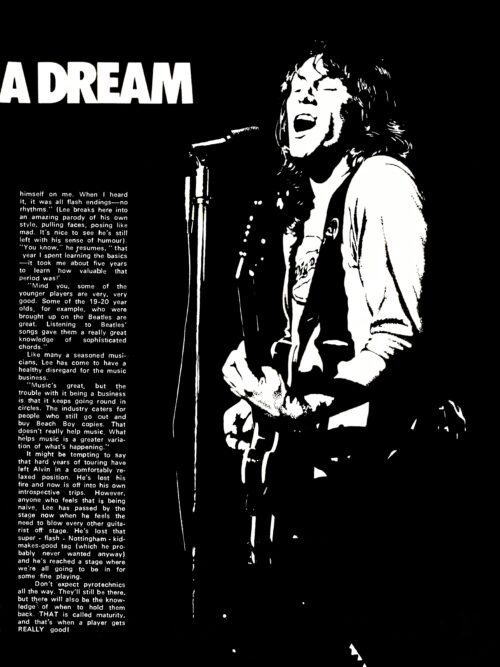 From the States dates Lee came to two distinct conclusions; because the smaller theatres were “a strange environment” the security forces were totally able to control the audience and so prevent a suitable ambiance in the music. In fact, only six of their dates really impressed him. So next time round he intends to “strike a medium” between the low and high venues. Secondly; the band wasn’t all it should be. “I think where it fell short – well, in some places it didn’t, it was great but elsewhere it was just a bit cold, a bit sessiony,” he remarks. “I get it too. If I’m playing and I turn round on stage and see everybody getting into the thing, but not getting off visibly, I’m not suddenly gonna get off and start leaping around, because I’d feel silly. “If I turn around and see, like Leo” (Lyons of TYA) “for example who’d always be thumpin’ an’ thrashin an’ sweatin’…..that kinda gives me a kick. “So I wanna go in the direction of keeping the musical taste I’m getting into, but produce a bit more kick and a bit more balls. That’s what it needs. In this band I’ve felt that the climax comes too late and too quick.” Alvin does not, however, lay the blame totally on his band. He mentions one problem that he still suffers from; the reputation of being “a rock `n’ roll, boogie-woogie, rave up-type guitarist”. Consequently audience response comes on what he calls “a trite three chorder”, rather than on, say the modern jazz which had preceded it. “There again,” he says, defending his boogie-woogie image, “when I get out on stage and I feel that vibe I actually want to do it. If the audience wants to get rockin’, I dig playing like that. It’s just that this band is almost too tasty to rock `n’ roll with effect. It’s so tight,” he elaborates , “that it gets boring quicker than if you’re playing with somebody who’s feeling something, and maybe they….uh…over feel and go off. But you get these new changes and new things happening. I’d really like to look for some fresh musicians.”