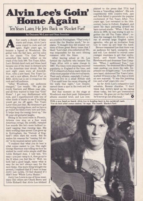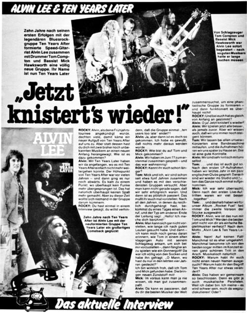 „Nach der Auflösung von Ten Years After hörte man nicht mehr allzuviel von Gitarrist Alvin Lee. Doch jetzt startet der schnellste Mann auf sechs Saiten ein Comeback. Er formierte die Gruppe Ten Years Later. Im März will das Trio auf Deutschland-Tournee kommen und dabei auch die Langrille ›Rocket Fuel‹ vorstellen.“