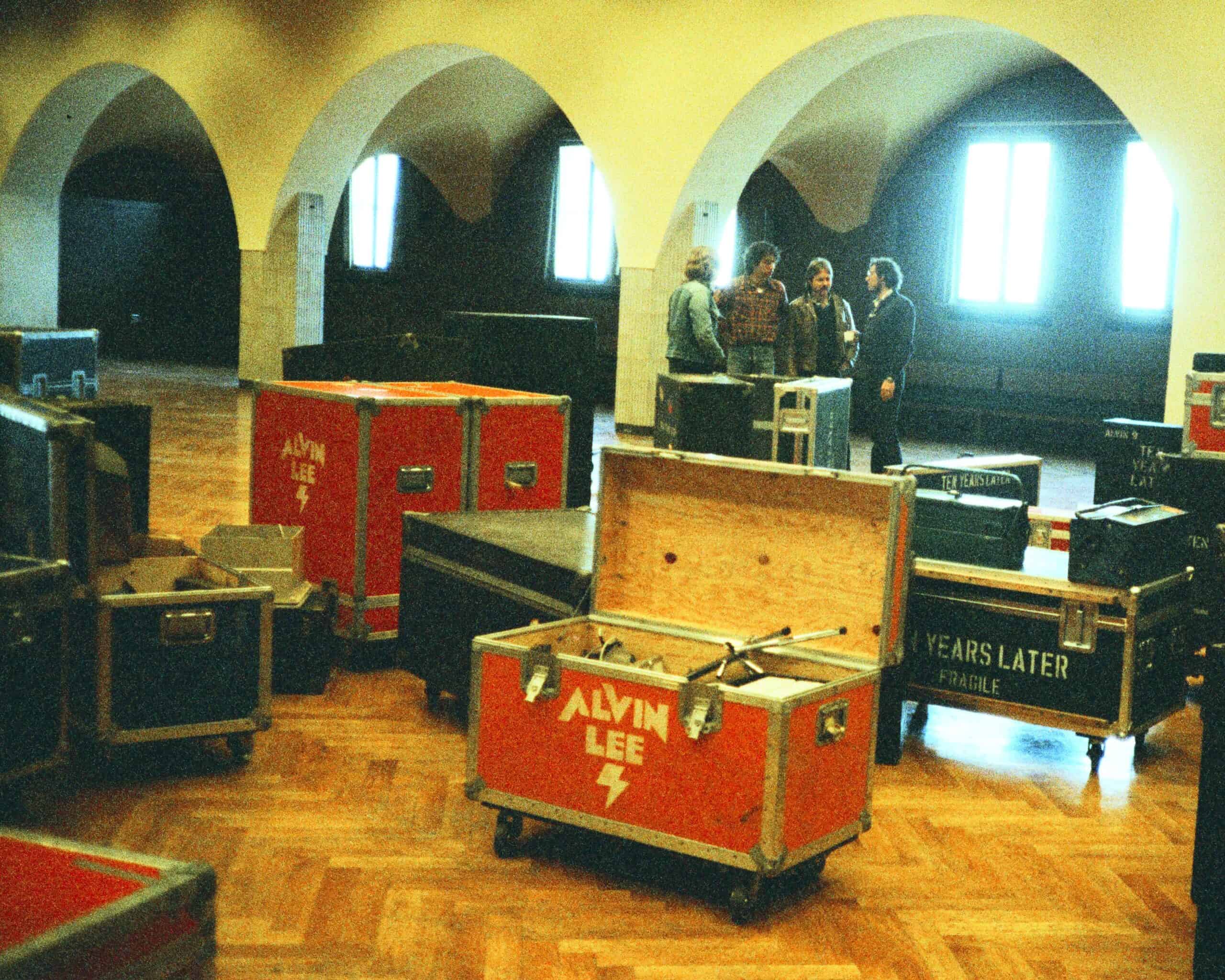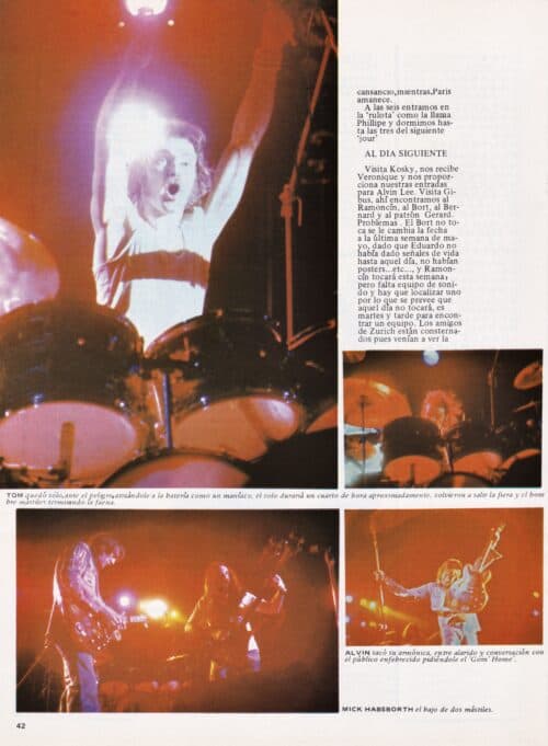 But all sense of proprieties of rock were stripped away as Alvin cocked his head to the chants of the audience – “Going Home” he asked ! The bands album, just released has already sold 300,000 copies in America, and after their European warm-up, eyes are already turning towards the States. To my surprise, it transpired that Ten Years Later have already played a tour of England, and Alvin, who went unrecognised in Manchester, was told he was a brilliant young guitarist who should get a recording contract. Alvin told the would be A&R man, that he already had nine albums. At one club, punks thought the added attraction was to be Johnny Rotten and the Sex Pistols, who were actually doing the same thing at the time, and on the same circuit. “They kept yelling for punk-rock, so I took a mouthful of beer and spat it all over them.” Said Alvin. “They loved it!” Certifiable Maniacs drove us through the streets of Paris at 70 miles per hour. Here the road crew, astounded by us descending