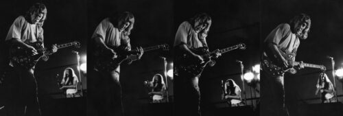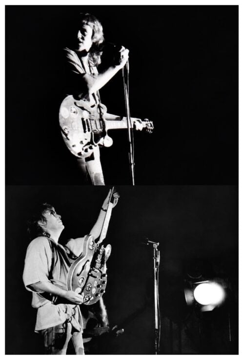 But Mick is the man to talk to about technology. He’s the only one who can switch his amplifier on”. Mick uses three bass guitars on stage, including a double-neck built for him by Peter Barraclough which weighs half a ton, but produces all kinds of exciting effects. “I’d use it all the time except that half way the set it does get a bit tiring,” said Mick. “I also use a Gibson RD-Artists Bass, a 1963 Gibson Thunderbird, and a Guild 301 Bass”. The RD-Artists Bass, is the one that Mick inevitably tosses into the air at the end of his solo, with a dramatic if dangerous flourish. Mick has been known to hit the steel girders above the stage with his bass and once broke the neck off of his beloved Gibson Artists, but he says: “I don’t really like breaking instruments, I don’t go along with that. Usually, I can catch it!” “I used to throw my Gibson across the stage, so fast it would skim and bounce,” recalled Alvin fondly. “I did it every night for about three years, bang, bang, bang. Then one night it broke, accidentally. I felt a bit embarrassed. The guitar repair man told me, “If you put a maple neck on, they bounce better”. He knew all about it. I wasn’t fooling anybody.”