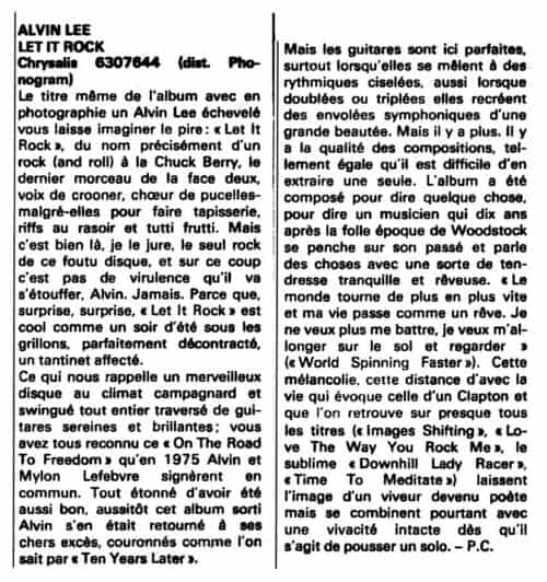 The very title of the album, with a photograph of a disheveled Alvin Lee, makes you imagine the worst: “Let It Rock,” precisely the name of a rock (and roll) by Chuck Berry, the last track on side two, crooner voice, chorus of reluctant young girls to provide the backdrop, razor-sharp riffs and tutti frutti. But that’s it, I swear, the only rock on this damn record, and this time it isn’t virulence that’s going to choke Alvin. Never. Because, surprise, surprise, “Let It Rock” is as cool as a summer evening with crickets, perfectly relaxed, just a little affected.