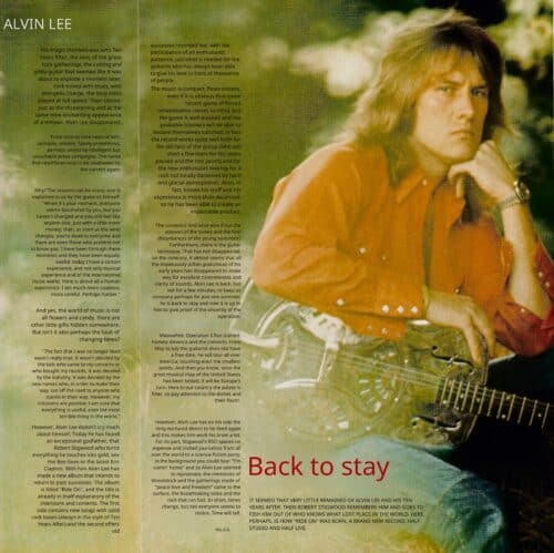 There comes a time in a rock musician’s career when the clamour and controversy that surrounded his early battles to break through to the public, fades away and becomes of little consequence. Alvin Lee has known adulation, fame, money and the accompanying hard slog that brought him from rhythm ‘n blues obscurity in Nottingham, to rock ‘n roll fame on the international stages of rock. Alvin did it all, and he did it first, almost according to the Rock-Star text book. Big – Money tours of America, rows within Ten Years After, the eventual split and retirement to the country mansion. It’s a familiar saga, except that Alvin, throughout it all, has remained simply and genuinely, a nice bloke. There is not a whiff oh egocentricity about the man, hailed as a guitar hero alongside the Claptons, Becks and Pages.