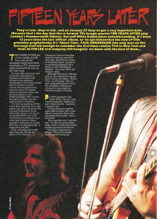 But naff White Rabbit jokes notwithstanding, it’s been fifteen years since the last “official” album, so ’tis apt indeed that the new LP title proclaims prophetically: it’s “About Time”. PAUL HENDERSON (the only man on the Kerrang! staff old enough to remember the first time) catches TYA in New York and finds ALVIN LEE and company still boogiein’ on down with the best of them…