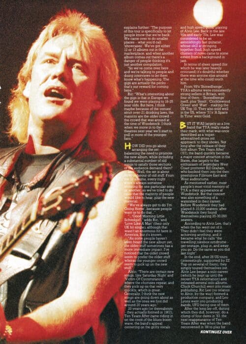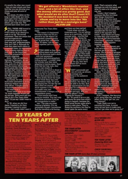 Alvin Lee: “After we did those festivals in Germany, we got offered a “Woodstock Reunion” tour, and a lot of offers like that, and the money offered was pretty good, but what would we do after that? Count it? We decided it was best to make a new album and try to move into the 1990’s rather than be a nostalgia band.”