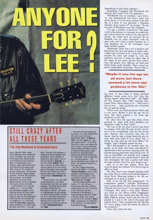 Something, I suppose, like Woodstock, the festival that made TYA US superstars. “Woodstock was an accident,” says Alvin. “It was disorganised and that’s what was great about it. It was never meant to be that big of a deal. It was declared a National Disaster Area wasn’t it?” he laughs. “To me the star of Woodstock was the audience. “I’ve got a jumble of memories. The most vivid is the journey in, because we could only get within about ten miles of the site and no nearer, the roads were all jammed. So we bundled into an army helicopter with an open side and I had a safety harness on. I was dangling out of the helicopter over half-a-million people. Backstage, there was a lot of politics and bartering over who was going on before who. I didn’t get involved in it. I went for a walk around the lake and joined in with the audience and saw it from the other side of the stage. It was great. No one knew who I was, but people were offering me food and drink being really friendly. There wasn’t so much camaraderie backstage. There’s been a lot more of that kind of thing between different bands since Live Aid. Like the “Guitar Speak” thing that I did, the “Night Of The Guitars” tour in 1988, starring Alvin Lee, Leslie West, Steve Howe and the rest, Alvin says, “that was a load of fun…and, guitarists are renowned for not getting along! There were ten lead guitarists on the bill, and it was great. Maybe it was the age we all were, but there seemed a lot more ego problems in the 1960’s.”