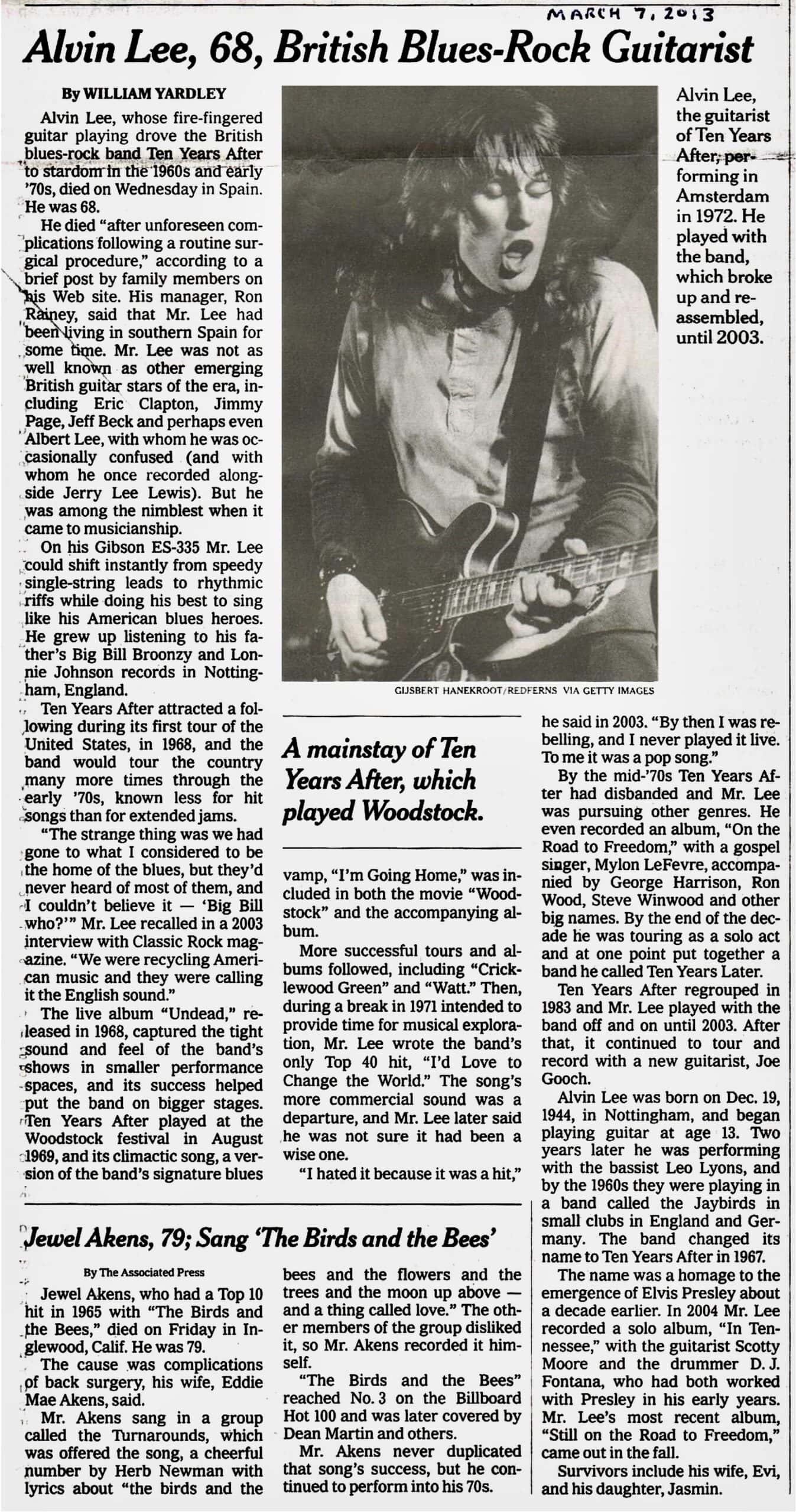 Alvin Lee passed away in Madrid at the age of 68, from unforeseen complications following a routine surgical procedure for atrial arrhythmia. He is survived by his wife Evi, daughter Jasmin, former partner Suzanne (Jasmin’s mother), sisters Irma and Janice and scores of fans around the world.