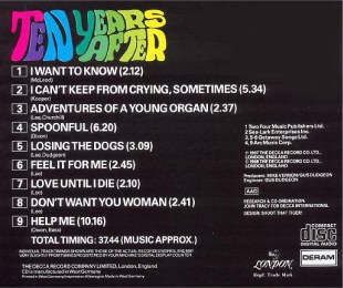 Singer and guitarist Alvin Lee along with Leo Lyons, Chick Churchill and Ric Lee, give a warm, intense and very personal touch to much of the standard material on this LP, which certainly has that lively edge, you sometimes can hear in original performances. My personal favourites are their dynamic treatment of Sonny Boy Williamson’s “Help Me” and the hectic starter, “I Want To Know.” Alvin shows his ability to blend bluesy guitar riffs with smoking jazz phrasing on this album. While Chick Churchill adds much of the uniqueness to the easily detectible Ten Years After sound. This record was their best, because of a beautiful freshness in sound and attitude which has never faded.