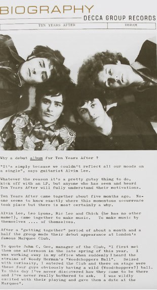 According to Ric Lee: “Ten Years After”, our first album for the Deram label, released on vinyl October 27, 1967, and was a collection of studio recordings of our live set.