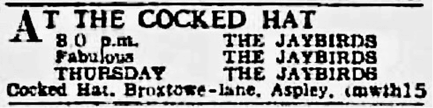 | October 18, 1963 | Nottingham | Rainbow Rooms | as The Jaybirds Chuck Berry Fans are specially welcome. Twitch ‘n’ Twist.![]() |