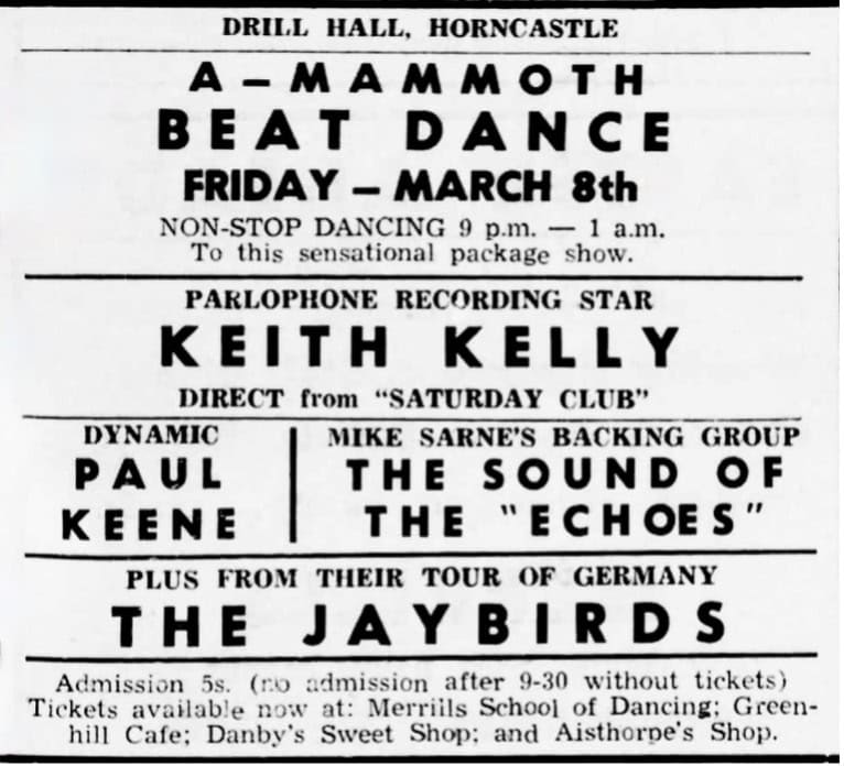 | March 8, 1963 | Horncastle, Lincolnshire | Drill Hall | as The Jaybirds![]() |