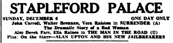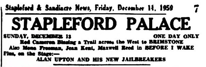 | December 20, 1959 | Stapleford, Nottinghamshire | Stapleford Palace | as Alan Upton and His Jailbreakers |
