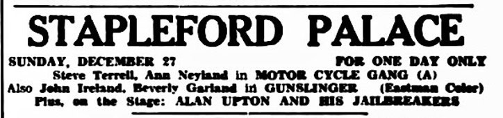 | December 27, 1959 | Stapleford, Nottinghamshire | Stapleford Palace | as Alan Upton and His Jailbreakers |