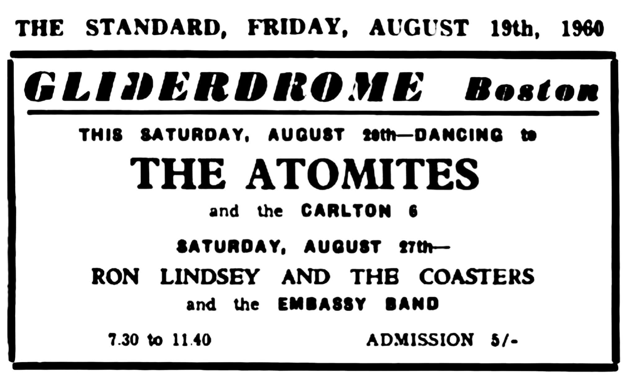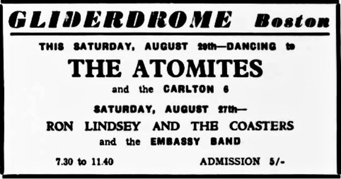 | August 20, 1960 | Boston, Lincolnshire | Gliderdrome | as The Atomites |