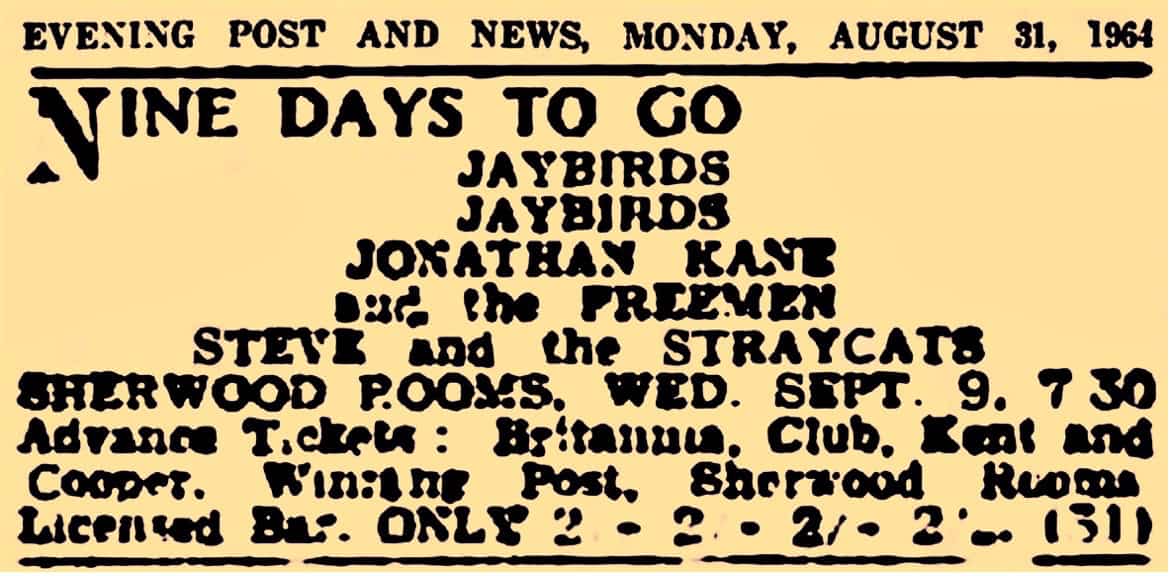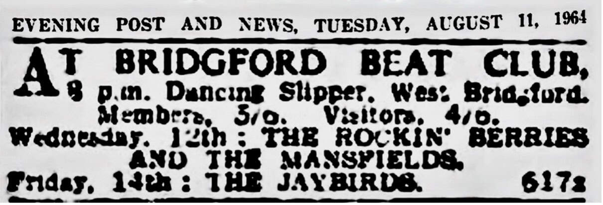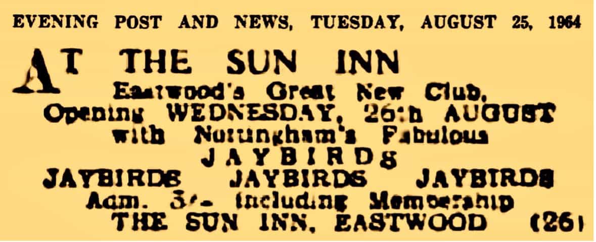 | October 18, 1963 | Nottingham | Rainbow Rooms | as The Jaybirds Chuck Berry Fans are specially welcome. Twitch ‘n’ Twist.![]() |