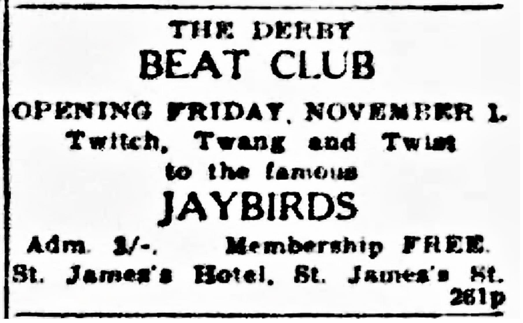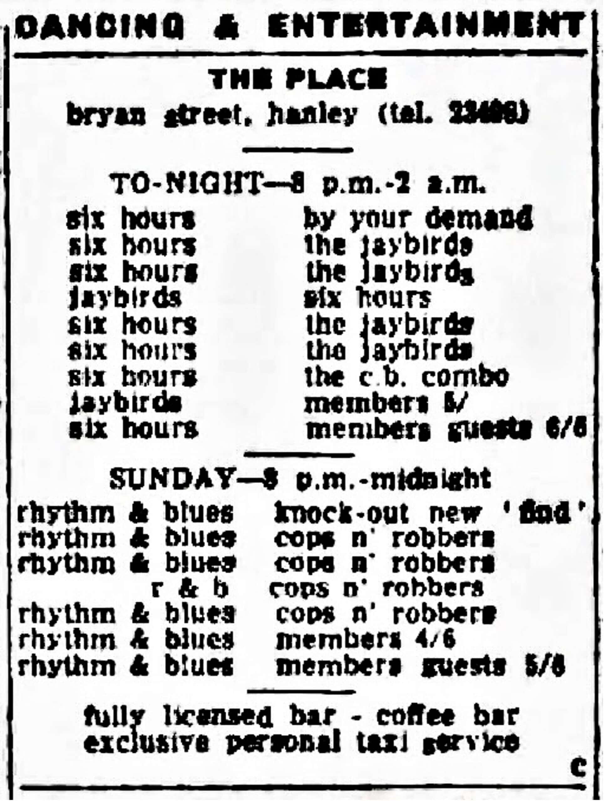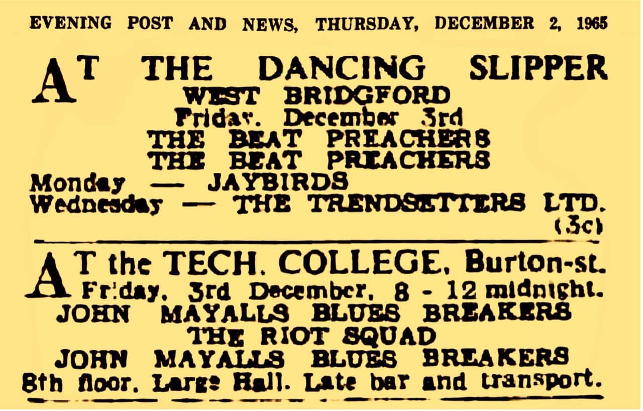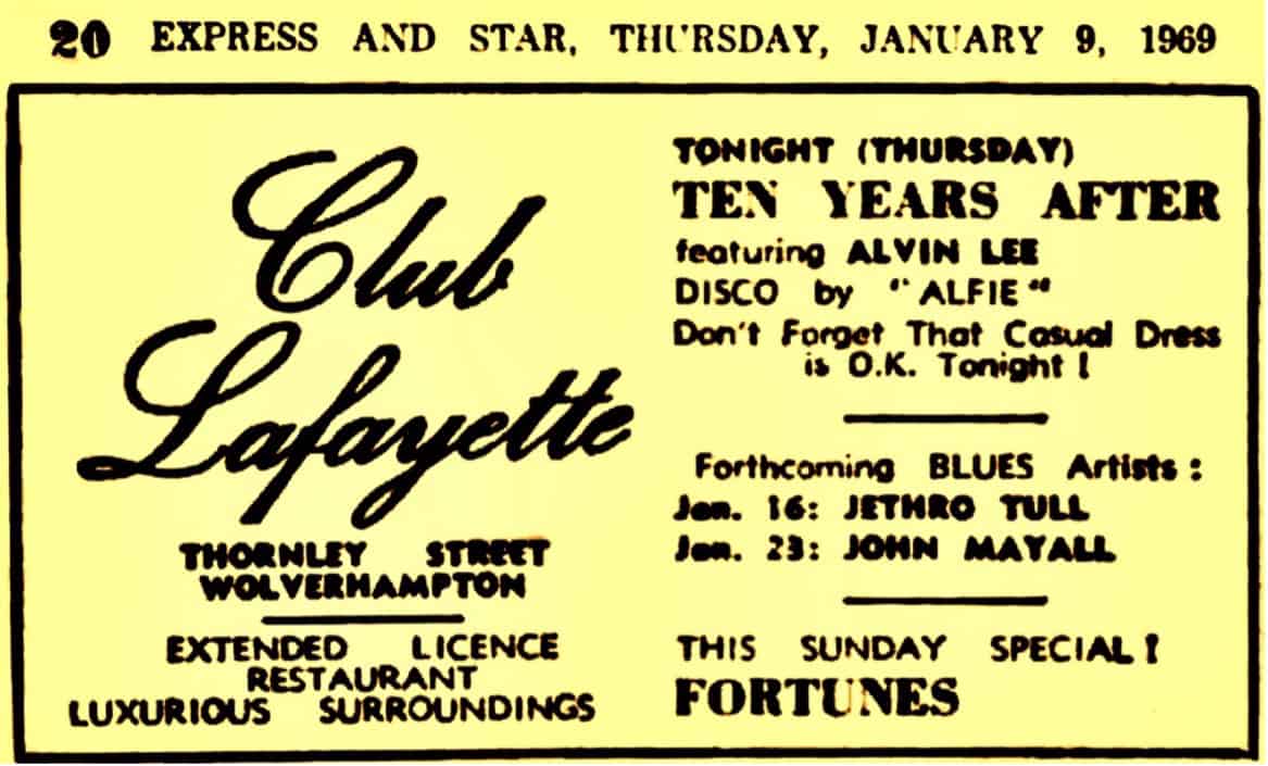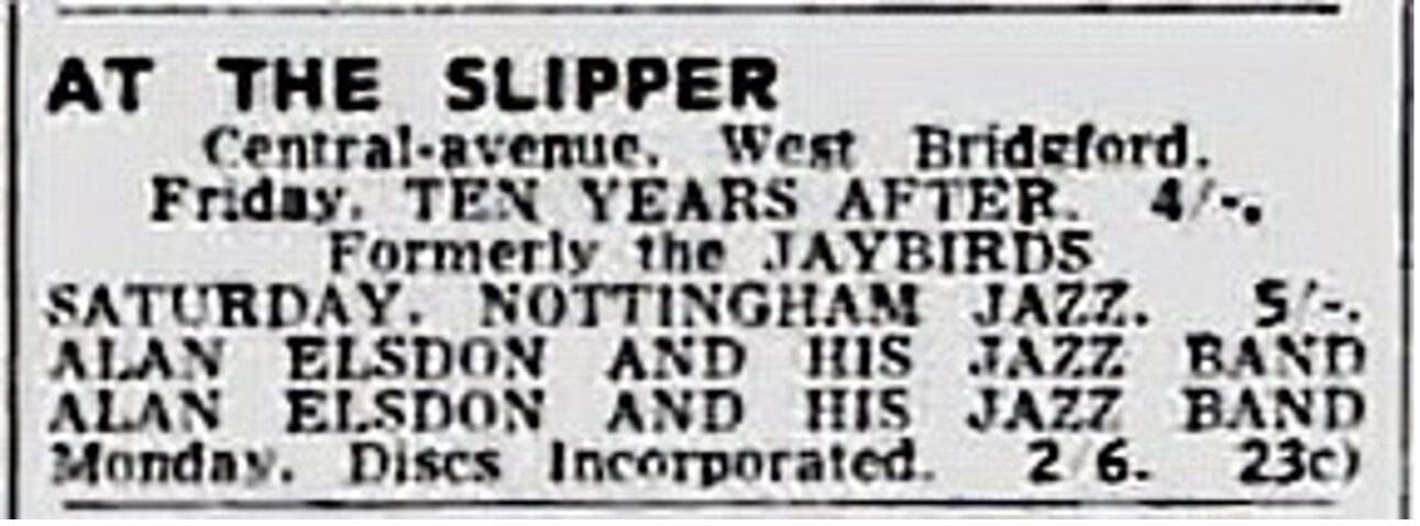 In the beginning Alvin Lee played venues like: The Palace Cinema, Sandiacre, Derbyshire / The Regal, Ripley, Derbyshire / The Palais Theatre (Civic Hall), Mansfield, Nottinghamshire / The Cocked Hat, Nottingham / The Rainbow Rooms (The Beat Club), Broadstreet, Nottingham / Commodore Ballroom, Aspley, Nottingham / YMCA, Shakespeare Street, Nottingham / The Gaumont, corner of Wollaton/Goldsmith Street, Nottingham / All Souls Church Hall, Ilkeston Road, Radford, Nottingham / St. Michael’s Church Hall, Sutton-in-Ashfield, Nottinghamshire / The Dancing Slipper, 14 Central Avenue, West Bridgeford, Nottingham (before it was named the “Locarno”” or the “Ballroom”. Not to be confused with the Victoria Hall, later renamed The Locarno Ballroom, at St Ann’s Well Road, Nottingham). “The Jaybirds were booked up solidly from December 10th 1963 to New Year’s Eve, and apart from local appearances they travelled as far as Norfolk and Banham.” – Midland Beat newspaper, December 1963. “We travelled 3000 miles a week in The Jaybirds van around Nottingham and up to Blyth and Selby, Leeds, Doncaster even as far as Scotland, London and the south coast.” – Alvin Lee, 2004 It may never be possible to uncover and list all of Alvin’s public appearances prior to TYA. Thanks to original newspaper clippings and the research by Stephen Howard from Notts Music Archive www.nottsmusicarchive.com a few dates could be tracked down. Further dates were added thanks to research by Josephine Pate, Susan Davis, Peter Wilson and Maurice Moore for the homepage about the Dungeon Club in Nottingham www.dungeonmods.wordpress.com |