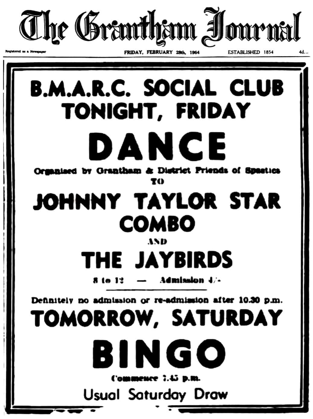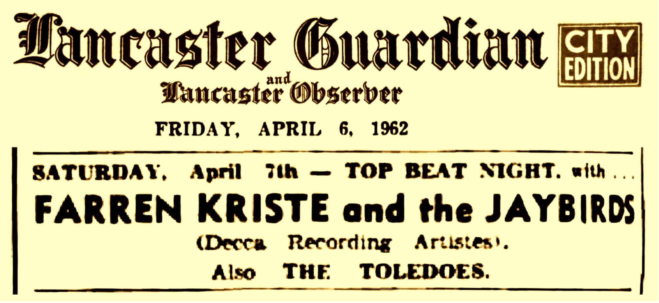 | February 8, 1962 | Nottingham | at the Press Ball at the Sherwood Rooms | as Farran Kristy & The Jaybirds |