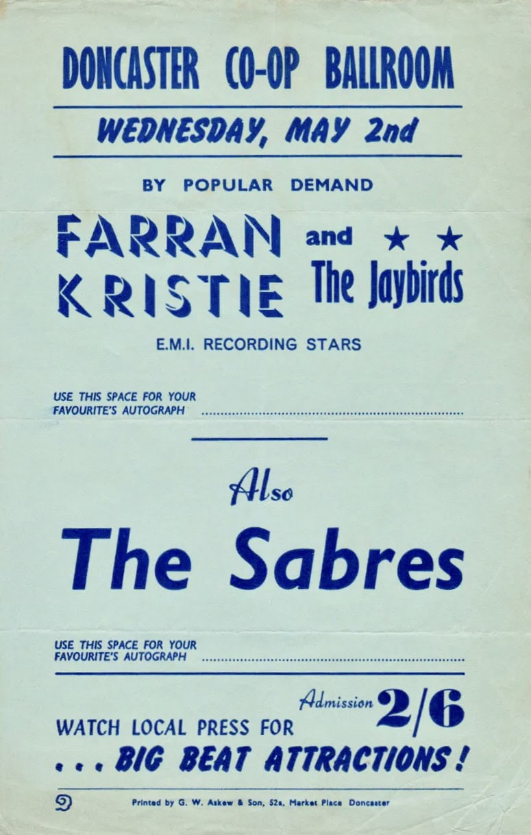 | May 2, 1962 | Doncaster, South Yorkshire | Co-Op Ballroom | as Farran Kristie & The Jaybirds |
