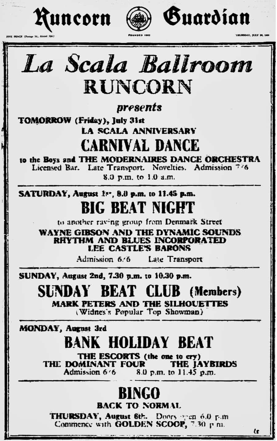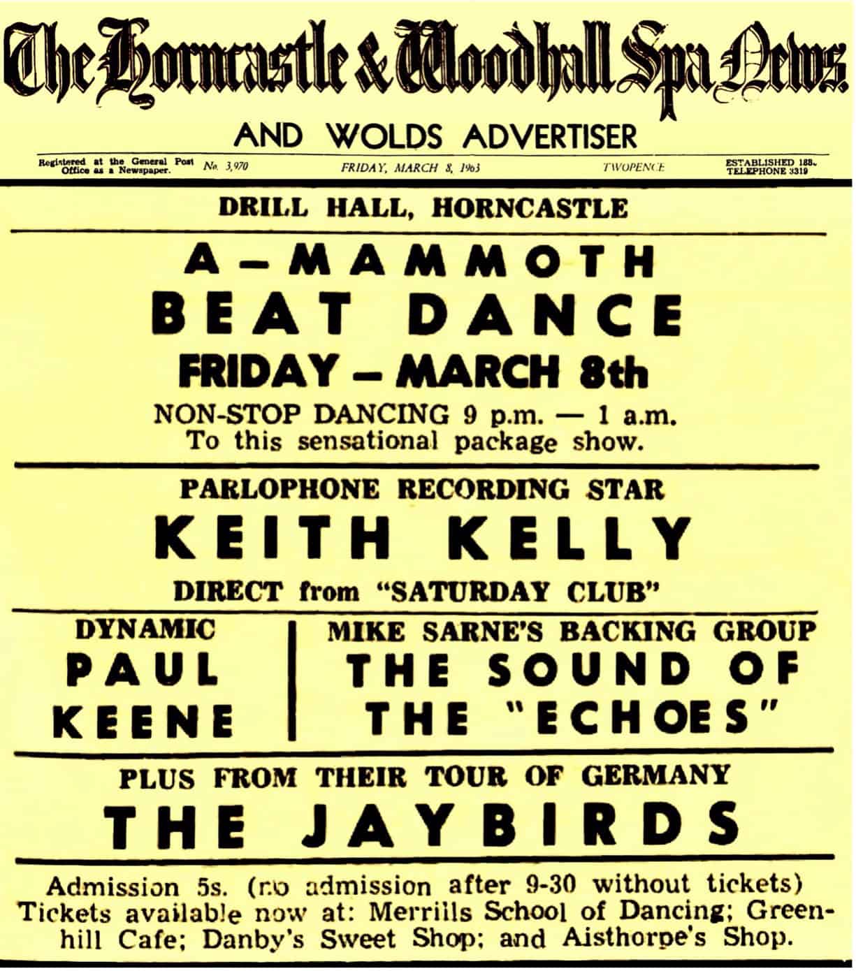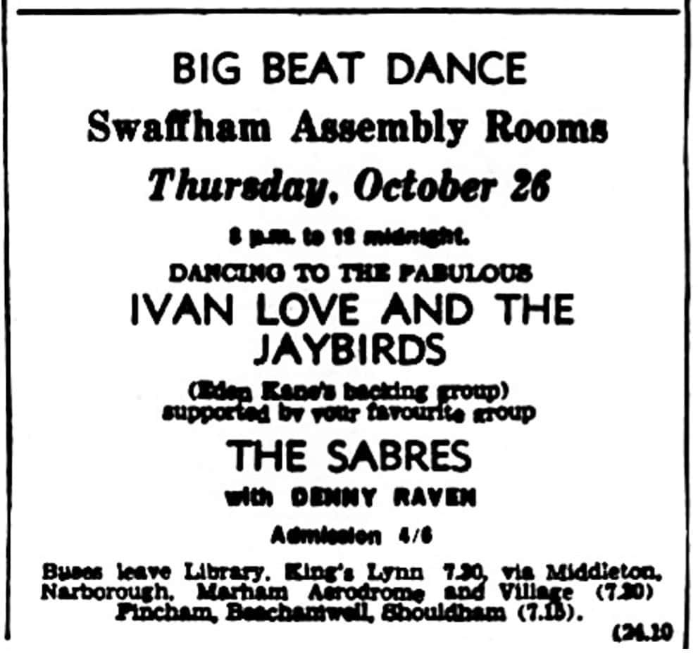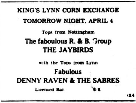 | May 25, 1963 | Banham, Norfolk | The Pavilion | as The Jaybirds with Denny Raven And The Swinging Sabres |