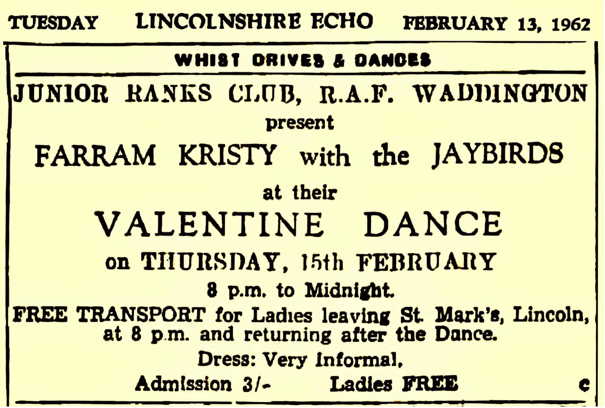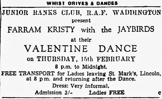 | February 15, 1962 | Waddington, Lincolnshire | Valentine Dance at Junior Ranks Club | as Farram Kristy & The Jaybirds |