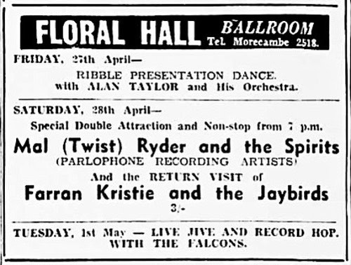 | June 2, 1962 | Morecambe, Lancashire | Floral Hall, Ballroom | as Farran Kristie & The Jaybirds with Les Ford And The Counter Beats |